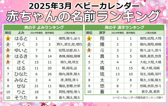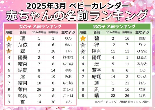 2025年3月生まれ 人気の名前ランキング|ベビーカレンダー月間名前ランキング調べ