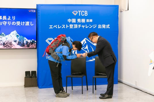 寺西理事長から安全を祈願するお守りと、山頂で広げる社旗が手渡された中園医師は、「TCBの理念の『私たちに関わるすべての人を幸せに』の気持ちを胸に世界の最高峰でこの社旗を掲げてきます。」と決意を表明。