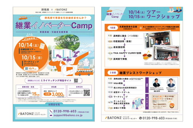 群馬県は、若手人材等に継業の魅力を訴求し、多様な担い手(継業イノベーター)の参入を促進するため、「継業イノベーターCamp」を今年度、初めて実施します。10/14(土)は先輩継業者の店舗やあとつぎ募集中の店舗を訪問し、10/15(日)は実際の継業を想定したワークショップを行いますので、群馬県内での起業や継業をお考えの方はぜひともご参加ください。