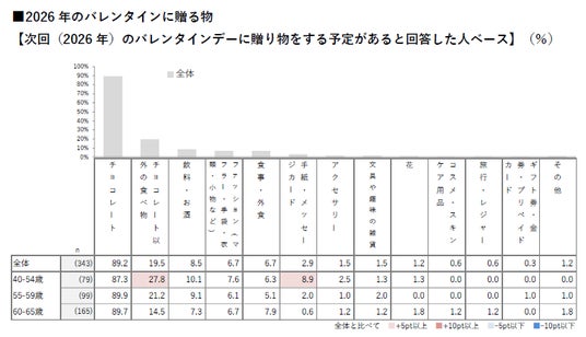 - 40~54歳では「チョコレート以外の食べ物(27.8%)」が他の世代に比べ高い。定番が主流の中、若年層ほど楽しみ方に広がりが見られる。