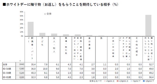 - 「次回(2026年)のホワイトデーに贈り物(お返し)をもらうことを期待している相手」について尋ねたところ、「贈り物(お返し)をもらうことは期待していない」と回答した人が52.7%と過半数を占めた。次点は「配偶者・パートナー(35.4%)」だった。