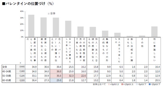 ■55~59歳では「自分へのご褒美として楽しむもの(32.3%)」「その時期限定販売の商品を買って楽しむもの(22.6%)」が他の世代より高く、バレンタインを“自分のためのイベント”として捉える傾向が見られた