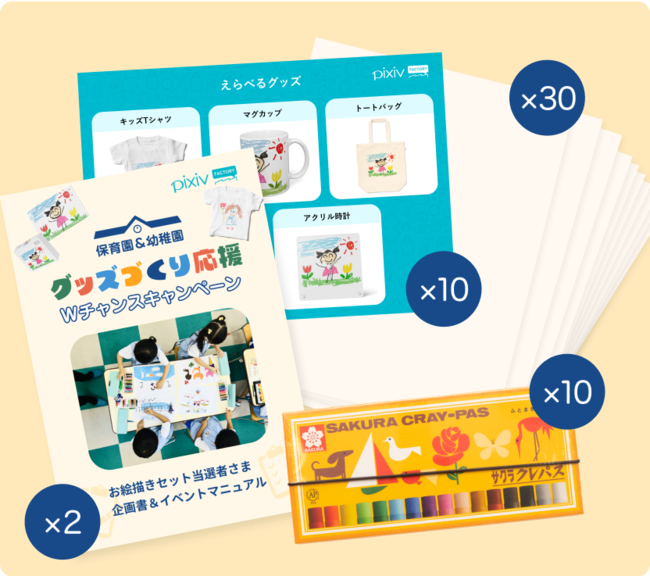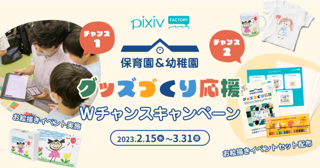 ピクシブ株式会社(本社:東京都渋谷区、代表取締役:國枝信吾、以下ピクシブ)は、グッズ制作サービス「pixivFACTORY」において、園児が描いたイラストを使用したオリジナルグッズづくりを応援する企画「保育園&幼稚園 グッズづくり応援Wチャンスキャンペーン」を、2023年2月15日(水)より開始します。