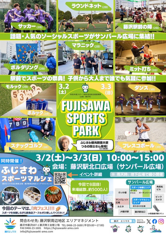 湘南鵠沼フレスコボールクラブ(以下略:SKFC)が参加する3月3日(日)には、ふじさわ観光親善大使の「つるの剛士」さんも来場予定です。同時開催で「ふじさわ肉フェス」も開催され、スポーツも食事も楽しめる盛りだくさんのイベントとなっております。