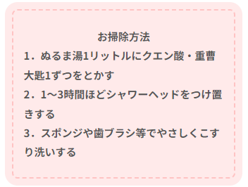 また、お風呂掃除の中でも意外と見落としがちなシャワーヘッドのお掃除に焦点を当てて、その掃除法も解説していますので、合わせてご覧頂けたらと思います。