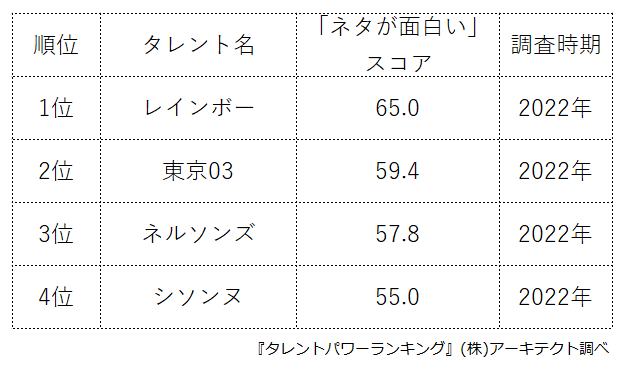 『タレントパワーランキング』では、タレントパワーランキングに登録されている「ネタが面白い」イメージを持たれている、お笑い芸人のスコアを調査。