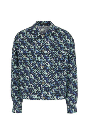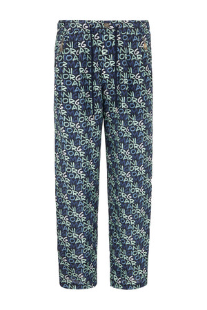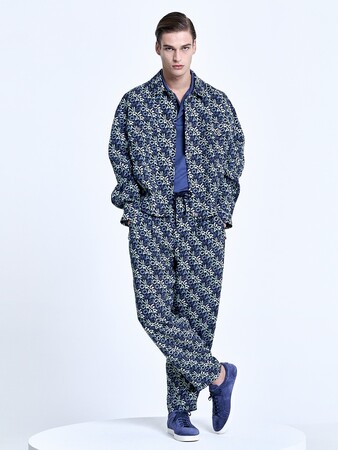 アイテム全面にブルーとグリーンでブランド名を描くブルゾンとパンツは、リサイクルキュプラを使用したアイテム。ブルーとグリーンでブランド名をアイテムの全面に描くというユニークなデザインでファッション性の高いアイテムながら、キュプラ特有の滑らかな手触り、流れ落ちるようなシルエットがアイテム全体を品よくまとめています。