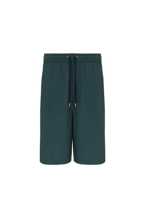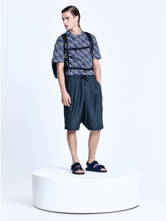 同じく真夏から活躍するアイテムとして、ショートパンツもおススメ。深いグリーンが美しいひざ下丈のショートパンツは、ヨセルという再生繊維を用いたもの。リヨセル特有の柔らかさを活かし、着用時にはタックが入るようにデザインを施しています。柔らかなドレープが生まれることによりカジュアルなアイテムながら上品さも兼ね備えています。