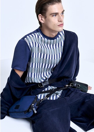 Tシャツもリサイクルキュプラを使用したものが登場。さらりとした肌ざわりが魅力のTシャツは、表身頃はリサイクルキュプラ、裏身頃にはオーガニックコットンが使用されています。オーガニックコットンは、通常のコットンに比べ生産段階において水の使用量が非常に少ない、環境に優しい素材です。かすれたような色合いのグリーン、ベージュ、ブルーを身頃に配し、袖部分はネイビーのソリッドカラーで仕上げました。涼し気な色合いでまとめられた1着は、日本の暑い夏にこそ着用したいアイテムです。