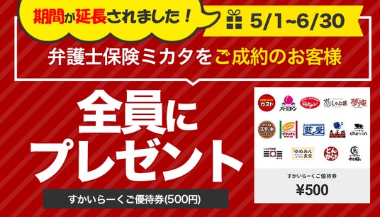 対象期間中に弁護士保険STATION経由で、ミカタ少額短期保険株式会社「弁護士保険ミカタ」の契約申込を完了し、ご契約が成立されたお客様全員に「すかいらーくご優待券(500円)」をプレゼントします。