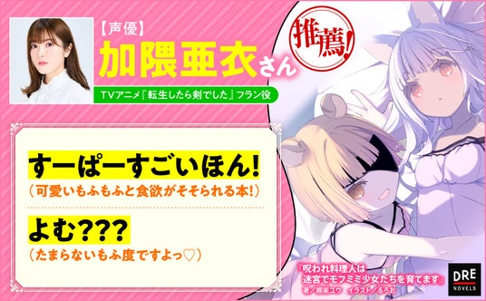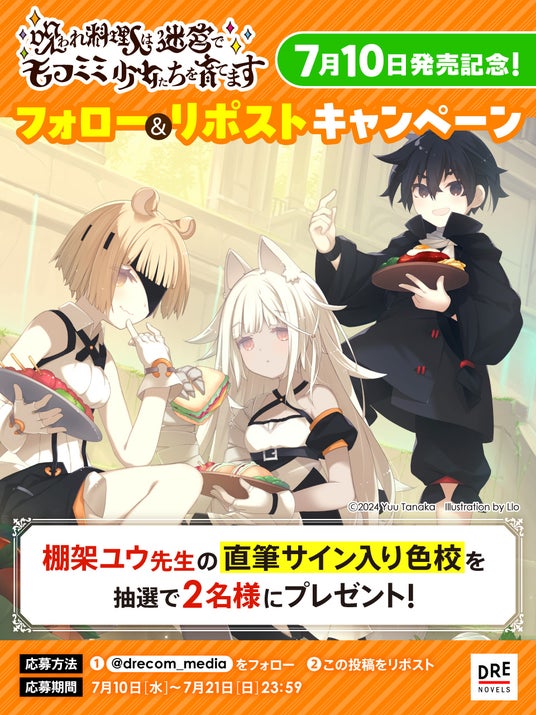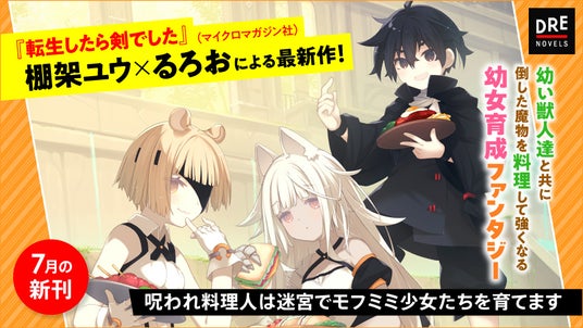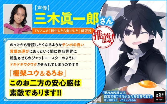 株式会社ドリコム(本社:東京都品川区、代表取締役社長:内藤裕紀)の出版・映像ブランド「ドリコムメディア」は、『転生したら剣でした』(マイクロマガジン社)の著・棚架ユウとイラスト・るろおが再びタッグを組んだ最新作、『呪われ料理人は迷宮でモフミミ少女たちを育てます』を2024年7月10日(水)にDREノベルスより発売いたしました。また、声優の三木眞一郎さんと加隈亜衣さんより、本作へのコメントが届きましたのでご紹介いたします。