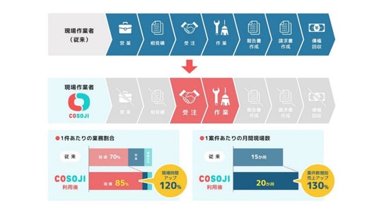 「COSOJI」は、全国の各地域で3万人を超えるクルー(全国各地の現場作業員)が登録し、メンテナンス・工事の受発注が可能なプラットフォームです。