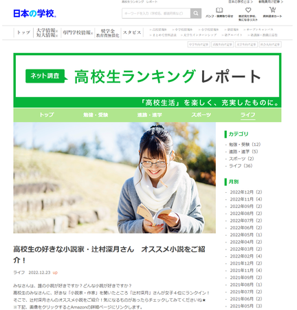 高校生ランキングレポート「高校生の好きな小説家・辻村深月さんオススメ小説をご紹介!」:https://school.js88.com/koukousei/life/56