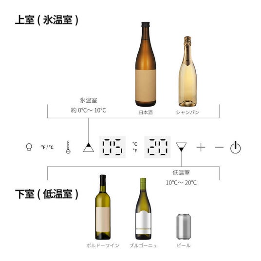 サカリュエ(s2290)は2温度管理で上室には一升瓶を立てて保管できるレイアウト。ワインだけではなくシャンパン、日本酒も楽しみたい方はぜひオフィシャルサイトを確認ください。