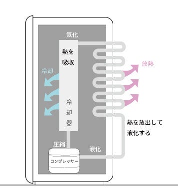 冷蔵庫と同様の冷却方式で熱エネルギーを運ぶ冷媒を循環させ、冷媒が液化と気化を繰り返しながら庫内を冷却。パワフルに冷却し、室温が一定ではなくても庫内の温度を維持しやすく、常にフルパワーで稼働する必要がないため消費電力が少ない。