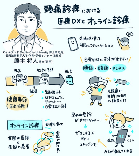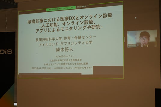 勝木医師は、これまでの脳神経外科医としての豊富な臨床経験を基盤に、頭痛診療における医療DX(デジタルトランスフォーメーション)の可能性について講演を行いました。