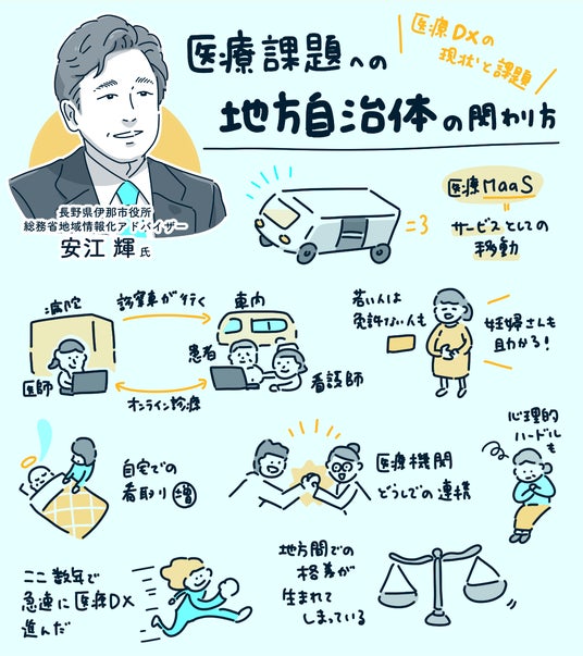 安江氏はさらに、医療DXの加速と法制度改革の相乗効果についても言及されました。従来は病院や診療所に限定されていた診療行為が、法改正により「居宅」や「移動車両」においても実施可能となることで、地域医療の提供体制が根本から変革される可能性を指摘されました。加えて、患者情報の一元管理システム、オンライン資格確認の普及、電子処方箋などの医療インフラ整備が進展することで、地方においても都市部と遜色ない医療サービスが享受できる環境が整備されると説明しました。