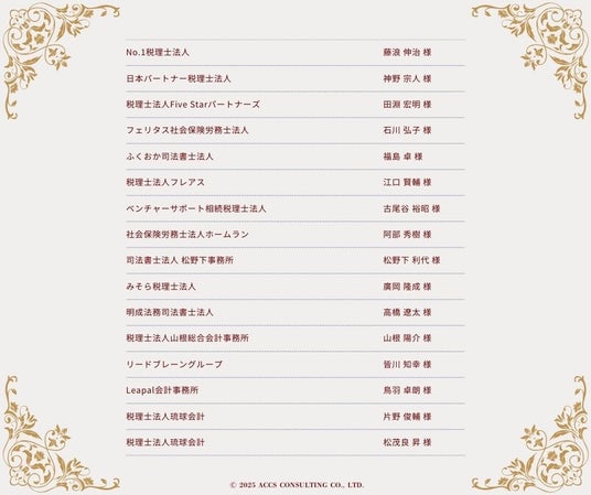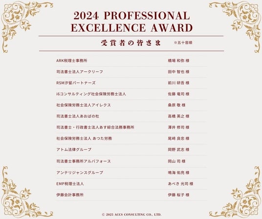 株式会社アックスコンサルティング(以下アックスコンサルティング、所在地:東京都渋谷区 代表取締役:広瀬元義)が運営する「士業オーナーズクラブ」(https://psoc.accs-c.co.jp/)は、2024年に士業業界に影響を与えた先生方を選出し表彰するイベントである「2024 Professional Excellence Award ~士業として卓越した成果をたたえて~」をホテル雅叙園東京(東京・目黒)にて開催いたしました。