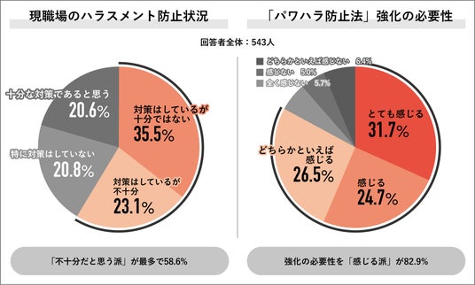 回答者全体の543人に現職場のハラスメント防止対策への印象を聞くと、「不十分だと思う派」が58.6%で最多となり、内訳は「対策はしているが十分ではない」が35.5%、「対策はしているが不十分」が23.1%となりました。また、「パワハラ防止法」強化の必要性を感じるかを聞くと、「必要性を感じる派」が82.9%で過半数を占め、内訳は「とても感じる」が31.7%、「感じる」が24.7%、「どちらかといえば感じる」が26.5%となりました。