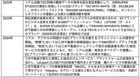これまでSUPER STUDIOと三井不動産は、リアルとデジタルを融合したコマース領域において、事業者の成長支援に向けた取り組みを継続してまいりました。