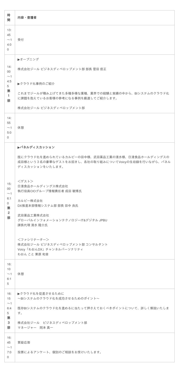 第1部では、これまでジールが積み上げてきた多種多様な業種、業界での経験と実績の中から、BIシステムのクラウド化に課題を抱えているお客様の参考になる事例を厳選してご紹介します。そして、第2部で豪華ゲストのパネルディスカッションを行います。最後の第3部では、BIシステムのクラウド化を成功させるためのポイントについて詳しく解説いたします。