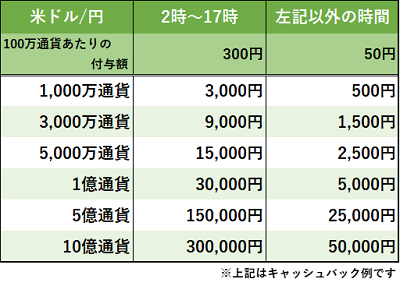 期間中のパートナーズFX「米ドル/円」の新規・決済約定数量の合計に対して、2時~17時は100万通貨ごとに300円、上限なしでキャッシュバックいたします。さらに、3月からは業界最狭水準スプレッドを提示している17~26時においても、100万通貨ごとに50円キャッシュバックをいたしますので、スプレッド縮小とあわせて、よりお得にお取引いただけます。