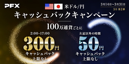株式会社 マネーパートナーズ(代表取締役社長:福島秀治、本社:東京都港区、以下「当社」)では、3月14日よりパートナーズFXで、3月の高額キャッシュバック キャンペーン第2弾を実施しております。対象は、「米ドル/円」と「トルコリラ/円」です。特に「米ドル/円」は3月よりキャッシュバック対象時間が拡大となり、24時間キャッシュバックの対象へパワーアップしました。