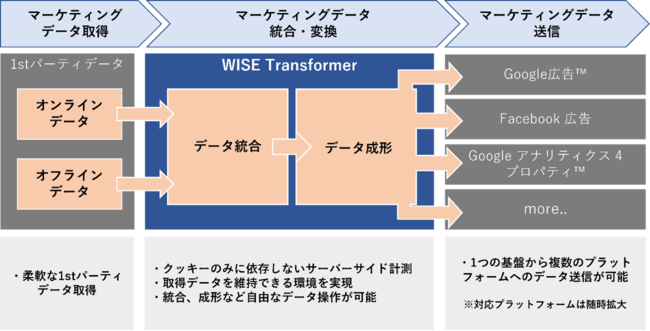 「WISE Transformer」は現時点で、Google広告™やFacebook、Google アナリティクス 4 プロパティ™に対応済みです。今後も随時、他の媒体やツールと連携していく予定であるため、「WISE Transformer」に基盤を一本化することにより、広告媒体・ツールごとに対応する場合と比べ、工数や費用の削減が可能です。
