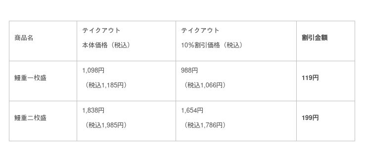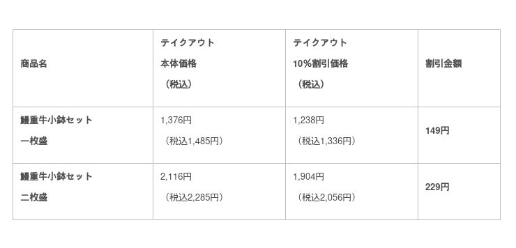 今年4月より販売開始した「鰻重牛小鉢セット」も割引対象商品となります。「鰻重牛小鉢セット」には、「鰻重」「みそ汁」「牛小鉢」「お新香」がついたお得なセットとなっております。