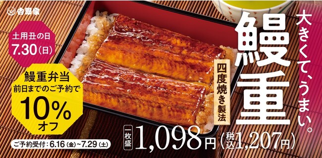 株式会社吉野家(本社:東京都中央区、代表取締役社長 河村泰貴、以下吉野家)は、土用の丑の日7月30日(日)に受け取りで「鰻重」「鰻皿」をテイクアウト事前予約注文した方に限り、会計時に税込価格から10%割引します。予約注文は6月16日(金)から7月29日(土)の期間、吉野家全店舗※にて店頭もしくは電話で承ります。
