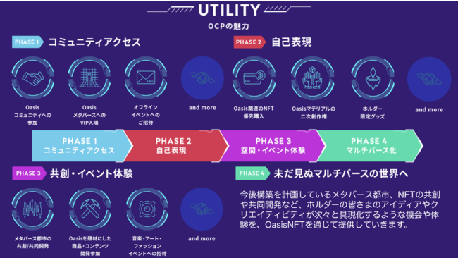 「Oasis」とあなたをつなぐ特別なNFTです。ありのままの自分を解放し、受け入れてくれる新たな仲間とともに、未完のコミュニティである「Oasis」の共創を通じて、新しい自分と出会い豊かさ、成長を体感いただけたらと願っています。OCPは2023年春に発行予定であり、第1弾のユーティリティとして「Oasisコミュニティ」へのアクセス権を付与します。OCPホルダーにコミュニティでの体験をより豊かにしていくためのユーティリティを提供予定です。さらには今後構築を計画しているメタバース都市、NFTの共創や共同開発など、ホルダーの皆さまのアイディアやクリエイティビティが次々と具現化するような機会や体験をOCPを通じて提供していきます。