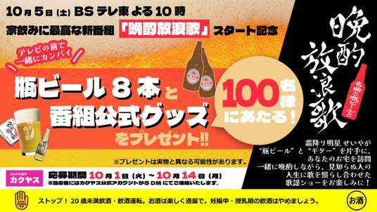 首都圏を中心に酒類等の販売、デリバリーを手掛ける株式会社カクヤス(本社:東京都北区、代表取締役社長:佐藤順一、以下:当社)は、宅飲み専門晩酌歌謡ショー「晩酌放浪歌~名曲と瓶ビールと~」を、明日10月5日(土)よる10時よりBSテレ東にて放送開始します。