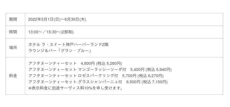 ホテル ラ・スイート神戸ハーバーランド(総支配人:檜山 和司 所在地:神戸市中央区)内のラウンジ&バー「グラン・ブルー」では、2022年5月1日(日)~6月30日(木)までの2ヶ月間、「Rich Mango Afternoon Tea」を販売します。