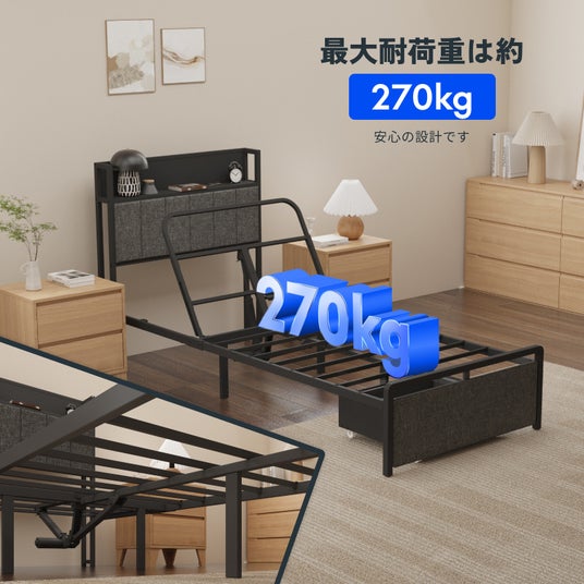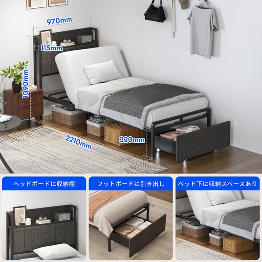 収納力抜群:ヘッドボードには小物が置ける収納スペース、ベッドフットには引き出し収納を装備。限られた寝室スペースも有効活用できます。