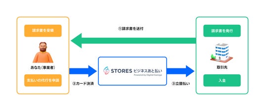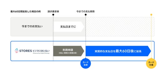 お店のデジタル化を支援する STORES 株式会社(以下、STORES) は、株式会社デジタルガレージが展開する請求書カード払いのサービス基盤を活用した、BtoB取引におけるあと払い決済サービス「STORES ビジネスあと払い by Digital Garage(※1)」の提供を本日より開始します。本サービスは、取引先から受け取った請求書の支払いをクレジットカード払いできるサービスです。支払期日が最大60日まで延長でき、資金繰りの柔軟性が向上します。また、銀行振り込みの手間を省き、業務の効率化にもつながります。