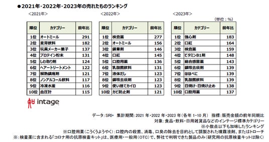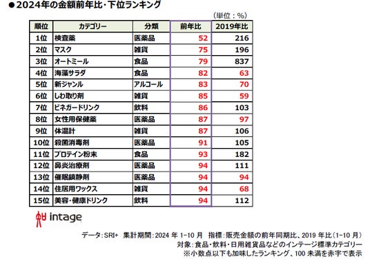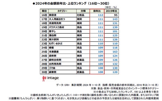 株式会社インテージ(本社:東京都千代田区、代表取締役社長:檜垣 歩、以下インテージ)は、全国約6,000店舗より収集している小売店販売データ、SRI+(R)(全国小売店パネル調査)をもとに、日用消費財の中で何がより売れたかを、推定販売金額の伸びから振り返る「2024年、売れたものランキング」を発表しました。(データは10月分まで使用)