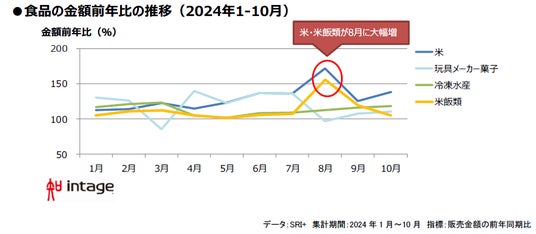 猛暑の記憶も色濃い今年。夏場に浮上した、もう1つの大きな社会トピックが米不足でした。スーパーの棚から米がなくなっていき、代わりにパックご飯が置かれる店も出る中、米の店頭価格も瞬く間に上昇していきました。その米が前年比130%で3位、10位にもパックご飯を中心とした米飯類(113%)がランクインしました。