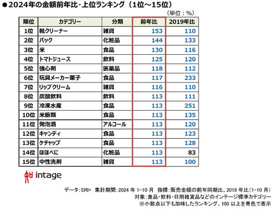 1位・靴クリーナー、2位・パックが躍進。3位・米以下、15位まで過半数が食品・飲料