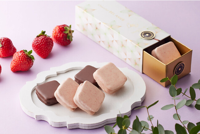 苺をテーマにした5種類のボンボンショコラはピューレやペースト、自家製のドライ苺など様々な形で苺を取り入れました。甘酸っぱい苺とショコラのマリアージュを存分にお楽しみいただけます。