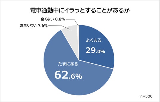 電車通勤をしている500人に「電車通勤中にイラッとすることがあるか」を聞いたところ、あるが「よく」「たまに」を合わせて91.6%にのぼりました。