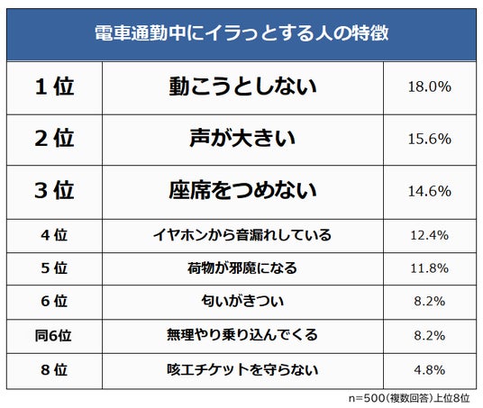・電車通勤中にイラッとする人の特徴1位は「動こうとしない」