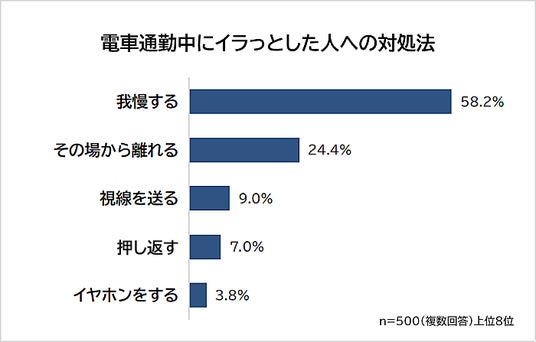 「電車通勤中にイラッとした人への対処法」を聞いたところ、1位は「我慢する(58.2%)」で、全体の6割近くを占めました。2位は「その場から離れる(24.4%)」となっています。
