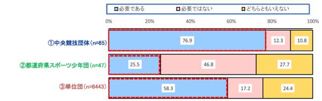 調査の結果、「小学生年代における全国規模の大会の必要有無(以下グラフ)」の「必要である」の回答は、中央競技団体は76.9%、都道府県スポーツ少年団は25.5%、単位団は58.3%となり、それぞれの組織において、大会の必要性に差異がみられることが明らかとなりました。
