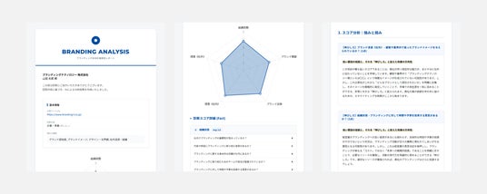 実務歴10年の有識者ノウハウと最新AI技術を掛け合わせた、ブランディング実務支援ツールです。30問の設問に回答することで、貴社ブランドの現状を客観的な数値で可視化。独自のロジックに基づき、優先すべき課題の特定から、対策の方向性、中期的なロードマップ案までをレポート化します。 「何から手をつけるべきか」という迷いを整理し、社内で建設的な議論を始めるための「確かな土台」をわずか数分で提供します。まずは現状の健康診断としてご活用ください。