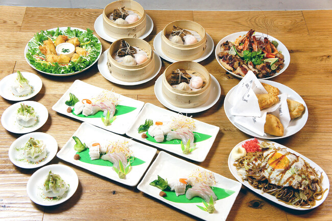 料理一例:パプリカの彩サラダ シュリンプのせ(ポムの樹)/鯛の刺身と島鱧の湯引き 梅肉添え(たまうどん)/パンツェロッティ(包み揚げ)4種のチーズ(瀬戸内シヲソバ3.5)/蒸籠点心盛り合わせ(麺飯点心 福幸)/トムヤムテイストの有頭海老と鶏のタイグリル(タイフード マンゴーキッチン)/油かす焼きそば(TAKOYAKI BAR REEF)/ クリーム大福 豆乳ソフト添え(豆と餅)