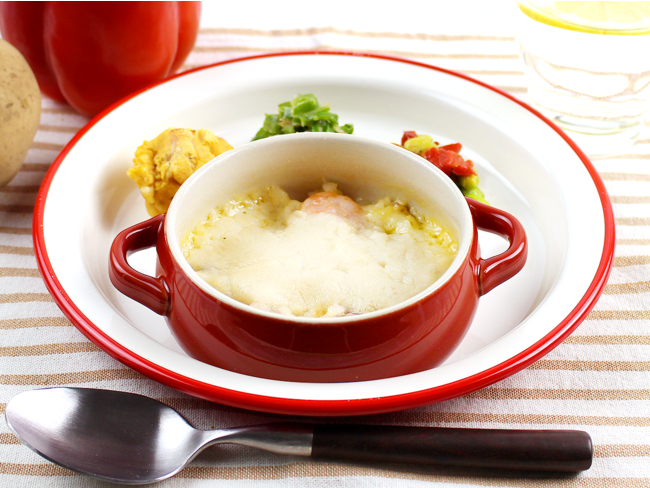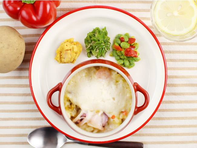 寒い季節に食べたくなる、クリーミーで、魚介の旨味のつまったシーフードリゾットです。香味野菜の入ったピラフに、あさり、海老、いか、4種チーズをトッピングし、深い味わいのホワイトソースで仕上げました。よく混ぜてお召し上がり下さい。