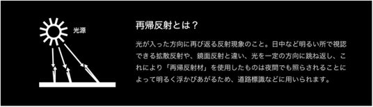光を一定方向に跳ね返すことで夜間の暗い環境下でも明るく浮かび上がります。