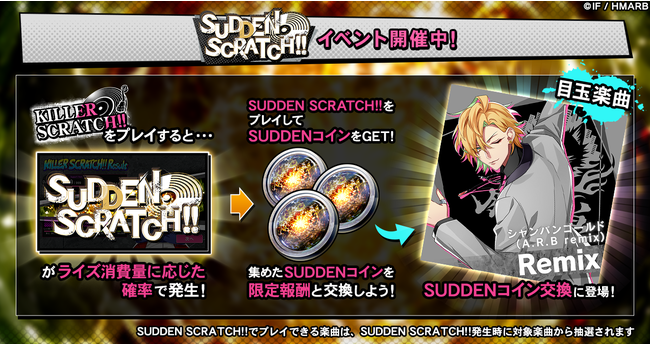 イベント期間中、KILLER SCRATCH!!をプレイするとライズ消費量に応じた確率でSUDDEN SCRATCH!!が発生します。SUDDEN SCRATCH!!をプレイすると、通常の報酬アイテムの他、限定アイテム「SUDDENコイン」を獲得することができます。「SUDDENコイン」を集めることで、新楽曲「シャンパンゴールド(A.R.B remix)」と交換することが可能です。詳細はアプリ内お知らせをご確認ください。