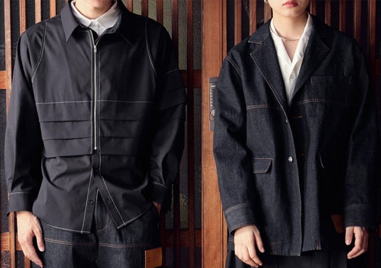 (左)OWT-0097 ベストレイヤード風切替シャツ (右)OWT-0088 デニムテーラードジャケット