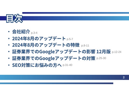 「証券業界でのアップデートの影響」では、実際の事例をもとに、アップデートによる順位変動と対策を解説しています。アップデートの特徴や、業界におけるSEO対策の重要ポイントにも注目です。